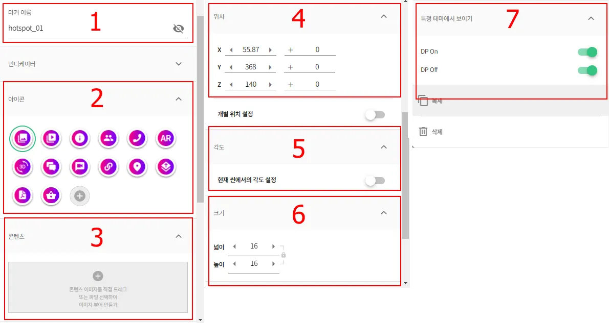 ③콘텐츠 영역은 모듈 타입에 따라 이미지, 비디오 URL, iframe 링크 URL, 링크 URL, 링크할 씬 등이 설정 가능합니다. 원하는 콘텐츠를 지정해보세요.