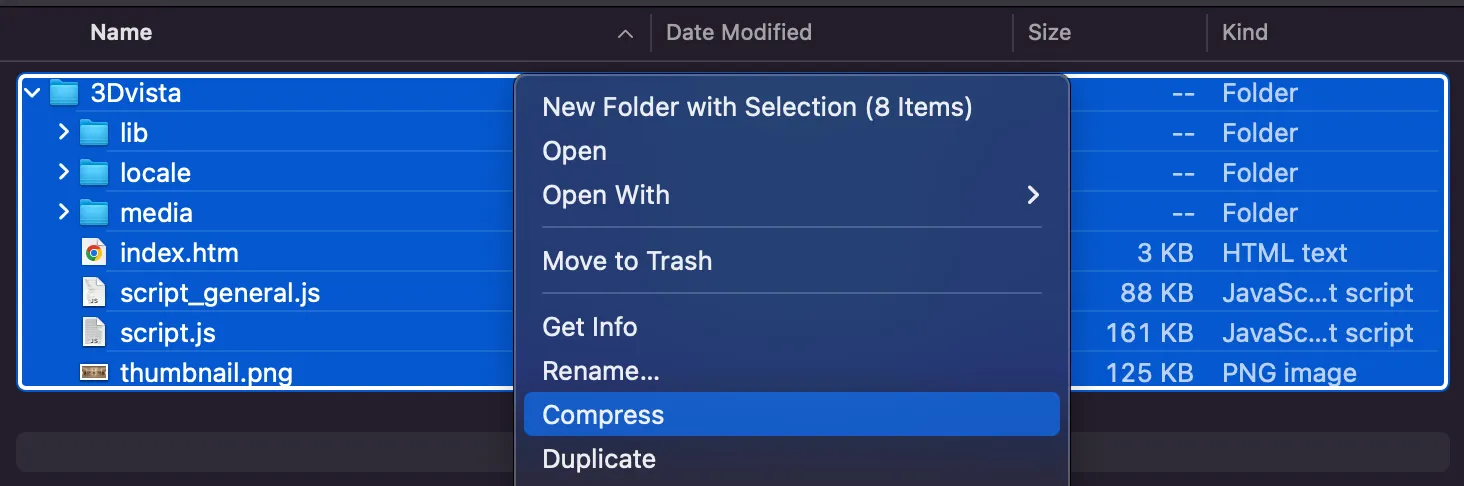 As shown in the image below, if the resources are placed within a subfolder (e.g., 3Dvista) and then compressed, the tour will not function correctly.