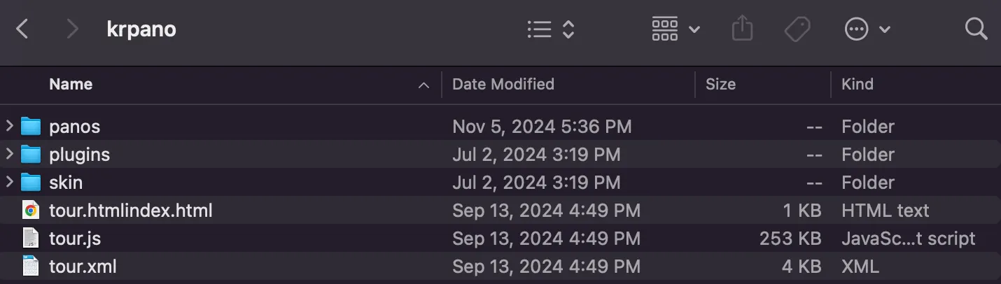.xml configuration files: Define the tour’s settings, scenes, camera positions, and hotspots.