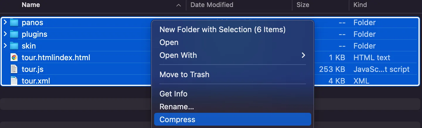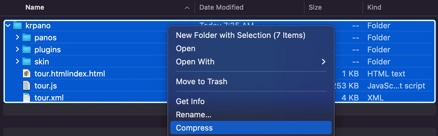 As shown in the image below, if the resources are placed within a subfolder (e.g., Pano2VR) and then compressed, the tour will not function correctly.