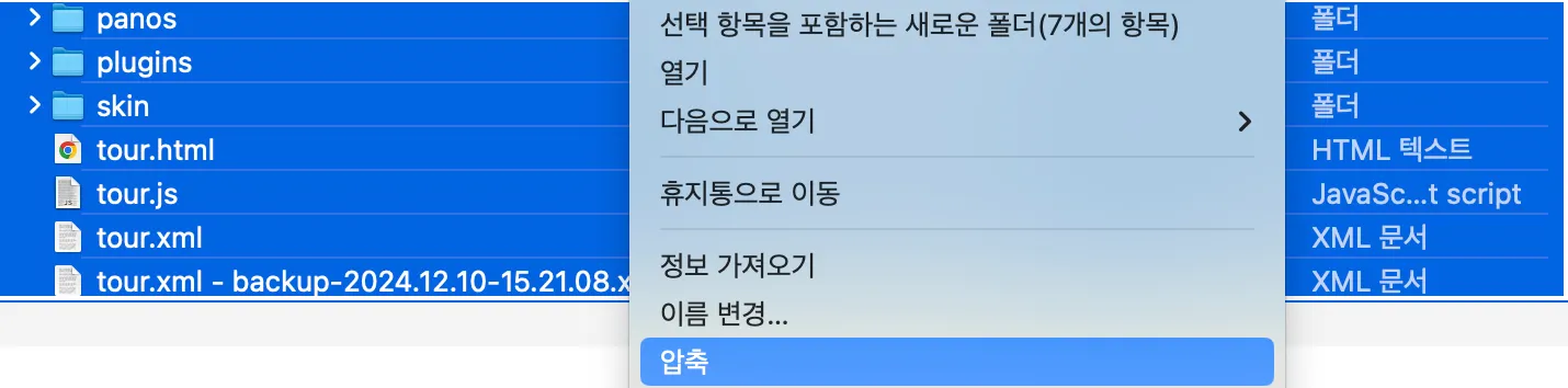 아래 이미지처럼 모든 리소스가 최상위에 있는 상태에서 ZIP 형식으로 압축 후 업로드하면 정상적으로 투어가 재생됩니다.