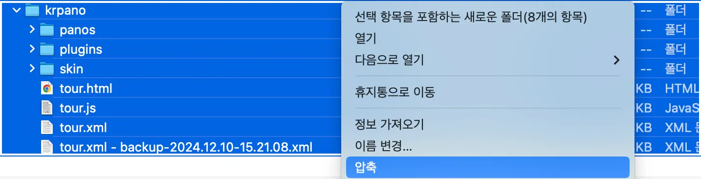 아래 이미지처럼 *krpano* 폴더 하위에 리소스가 포함된 상태로 압축하면 정상적으로 투어가 재생되지 않습니다.