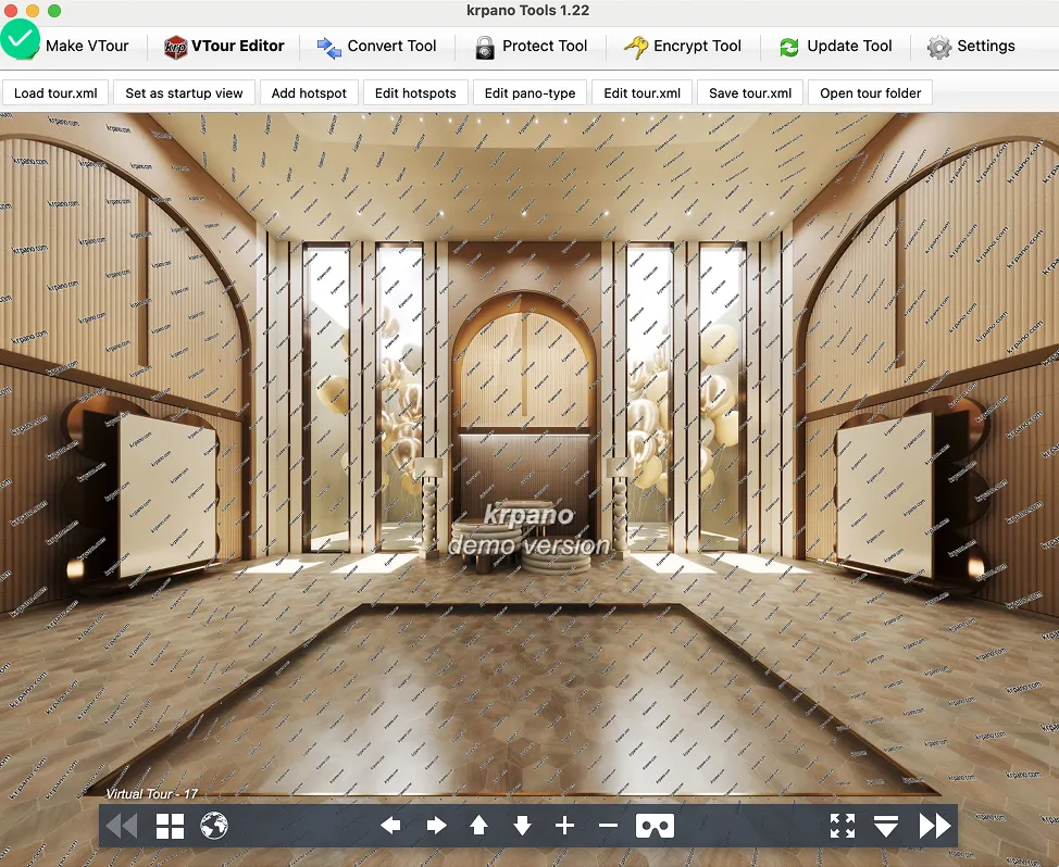 krpano에서 "VTour Editor" 기능을 사용하여 내보내기 전에, 가상 투어가 정상적으로 동작하는지 확인합니다.