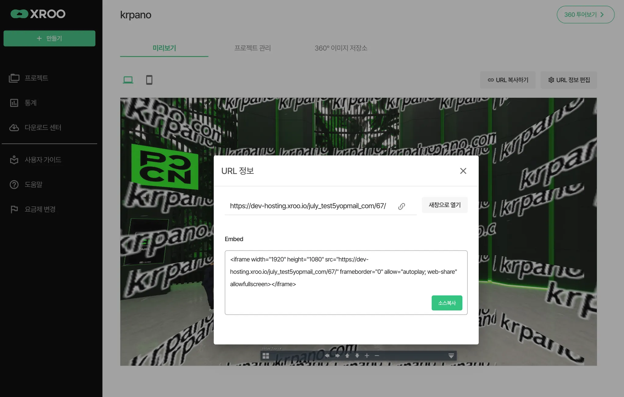 파일을 XROO에 업로드한 후, 아래 절차를 통해 가상 투어를 확인하고 공유할 수 있습니다.