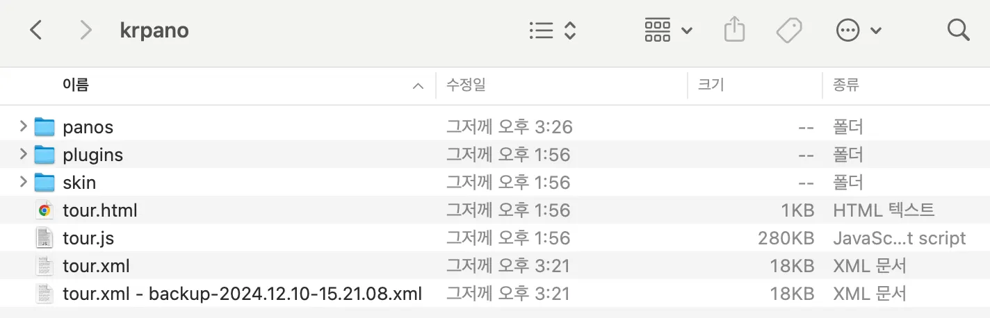 XROO에서 가상 투어를 원활하게 호스팅하려면 krpano에서 내보낸 파일 및 폴더 구조를 유지하는 것이 중요합니다. 아래는 가상 투어가 올바르게 작동하기 위해 권장되는 파일 구성입니다.