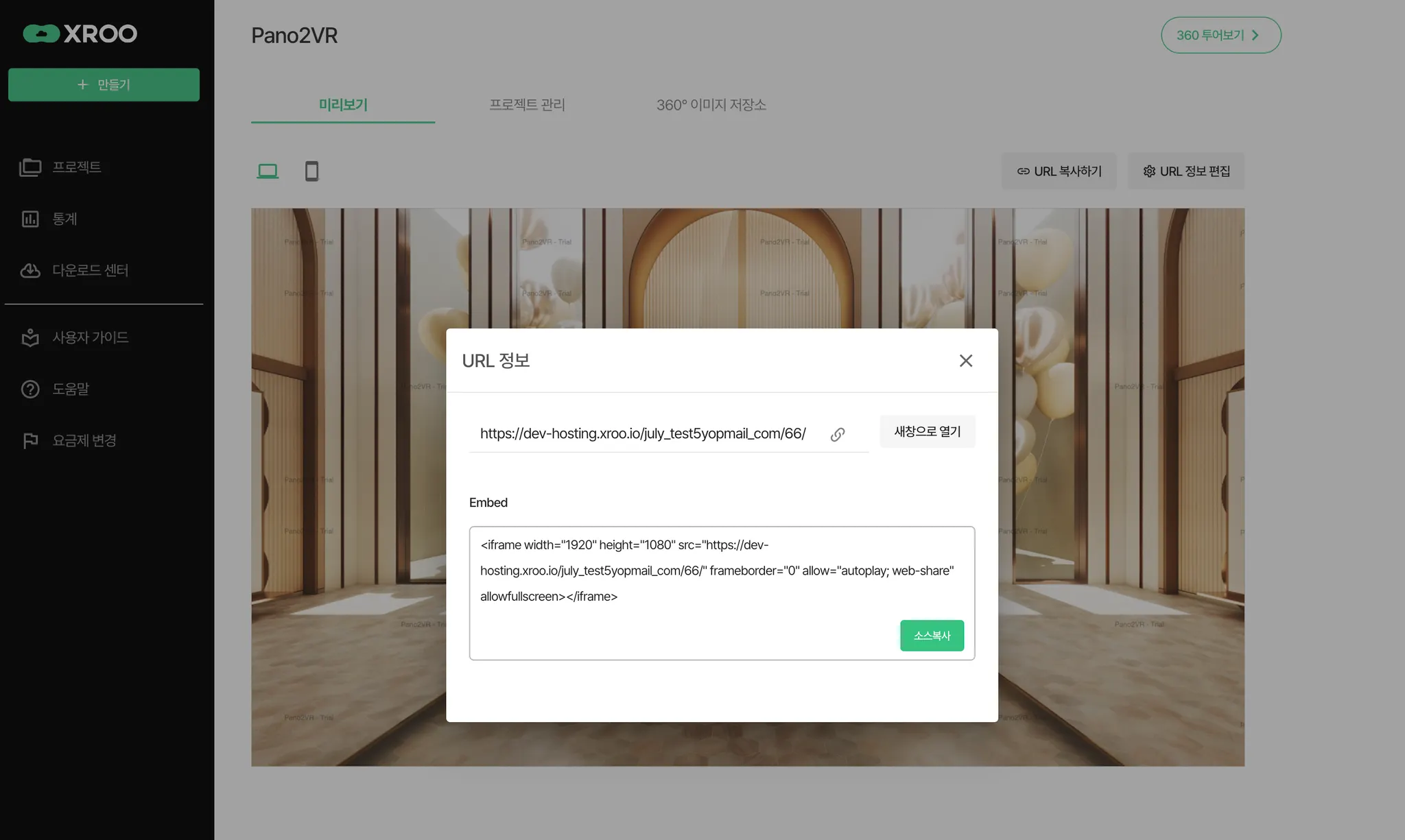 파일을 XROO에 업로드한 후, 아래 절차를 통해 가상 투어를 확인하고 공유할 수 있습니다.