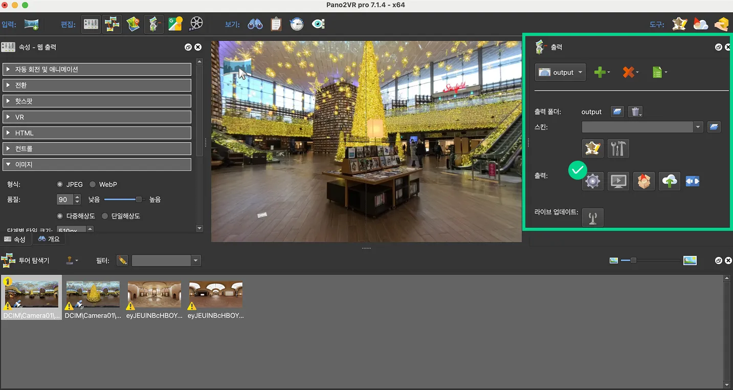 Pano2VR에서 "웹 출력" 기능을 사용하여 내보내기 전에, 가상 투어가 정상적으로 동작하는지 확인합니다.