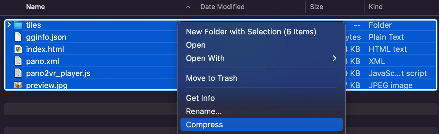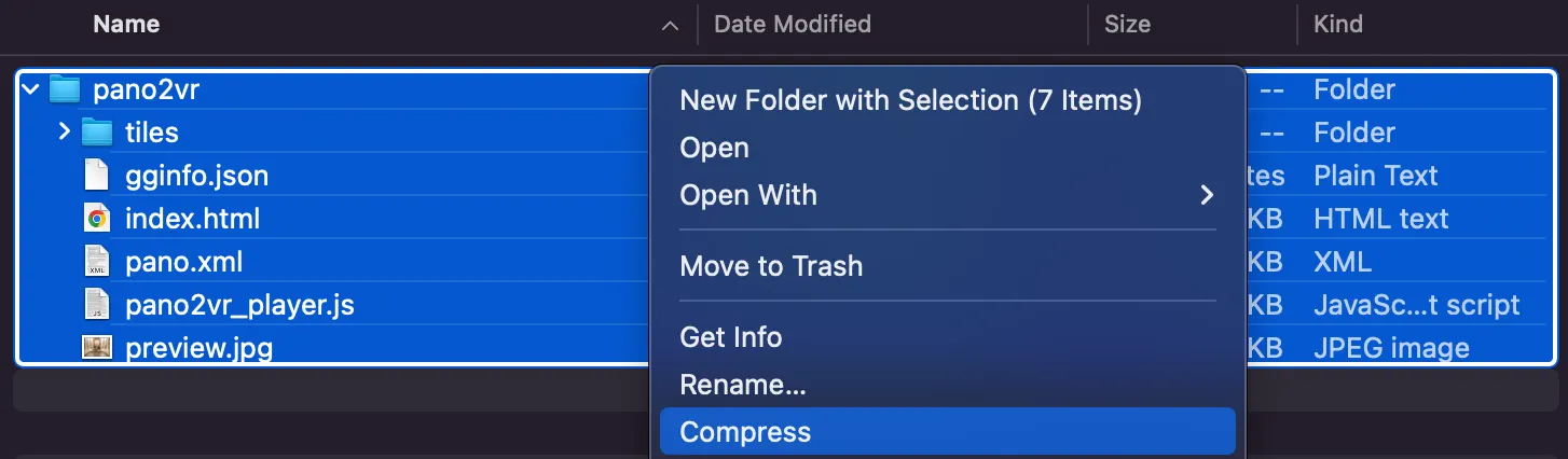 As shown in the image below, if the resources are placed within a subfolder (e.g., Pano2VR) and then compressed, the tour will not function correctly.