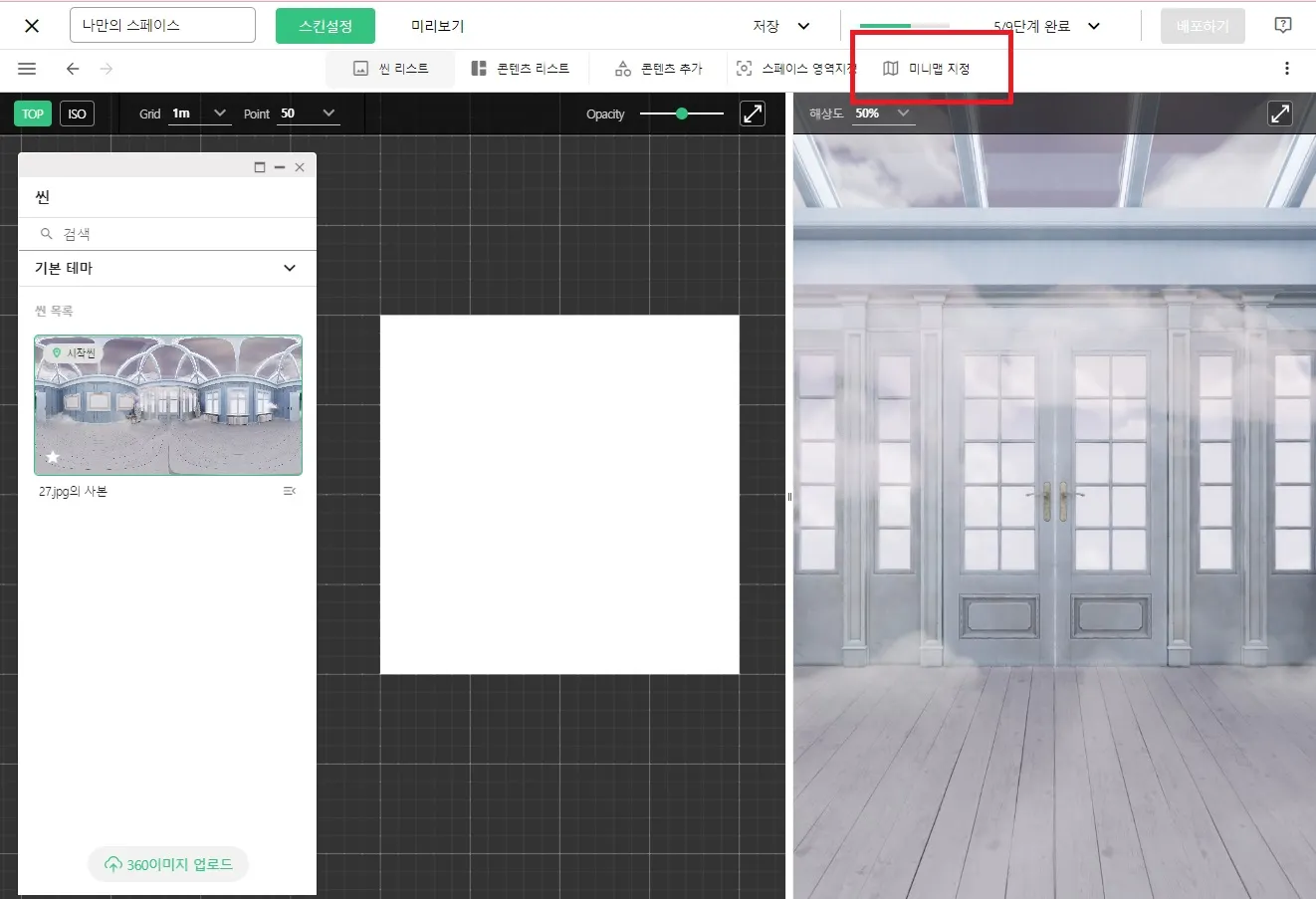 아래 내용은 모델링 파일이 성공적으로 업로드되고, 각 테마에 적절한 모델링 파일을 선택 완료했다는 가정하에 이뤄집니다.(플러그인에서 불러오기한 스페이스만 해당)