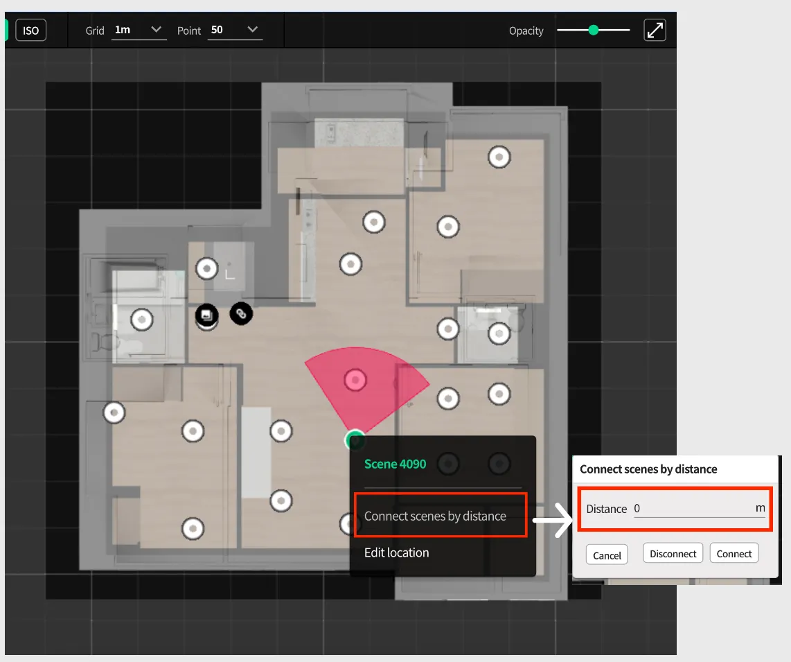 현재의 Scene 포인트 A를 클릭한 후 마우스 우 클릭하면 ‘거리 기준으로 Scene 연결’ 버튼이 출력됩니다. 버튼을 선택하면 AScene에서 BScene으로 이동할 수 있게 됩니다.