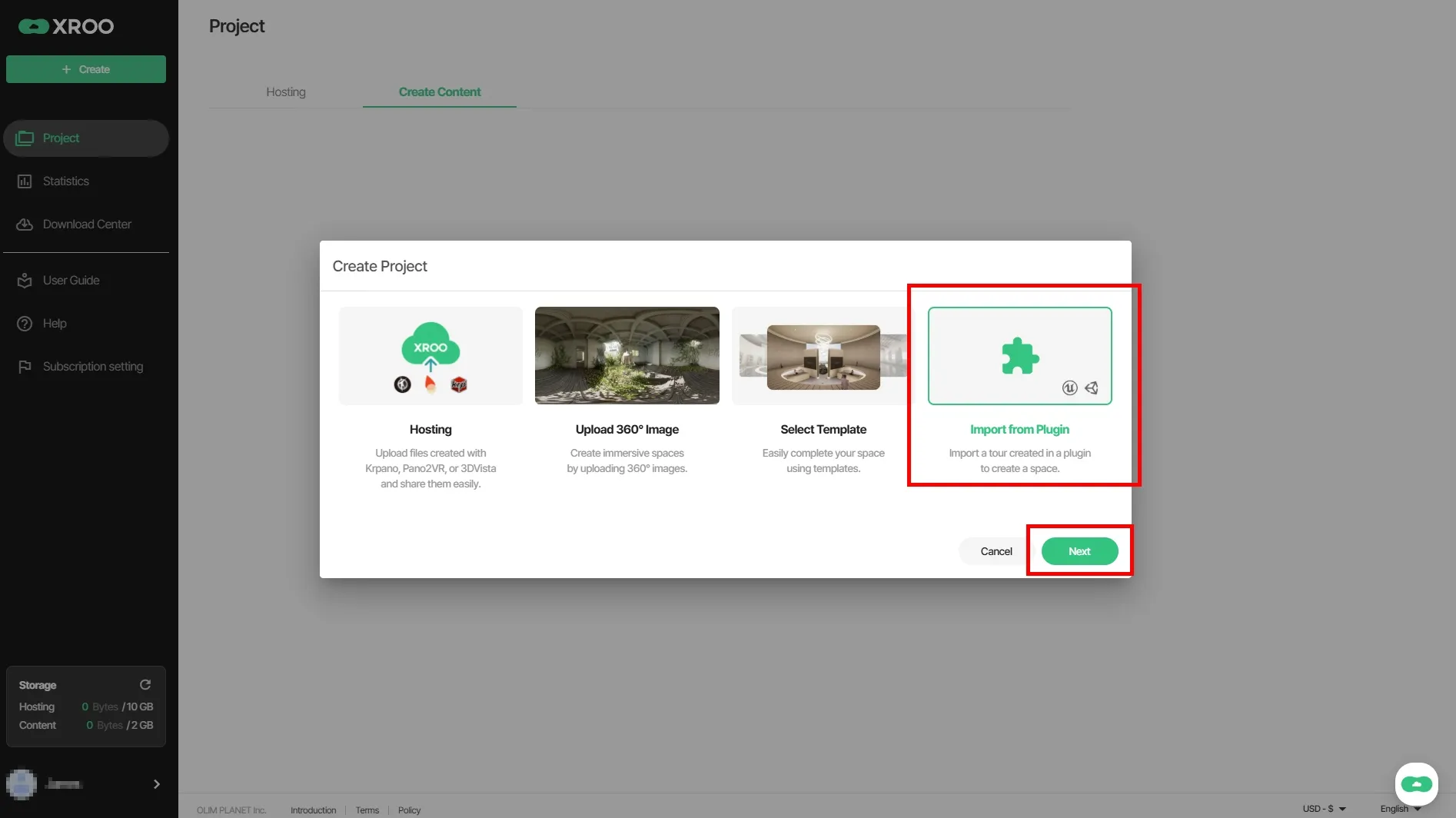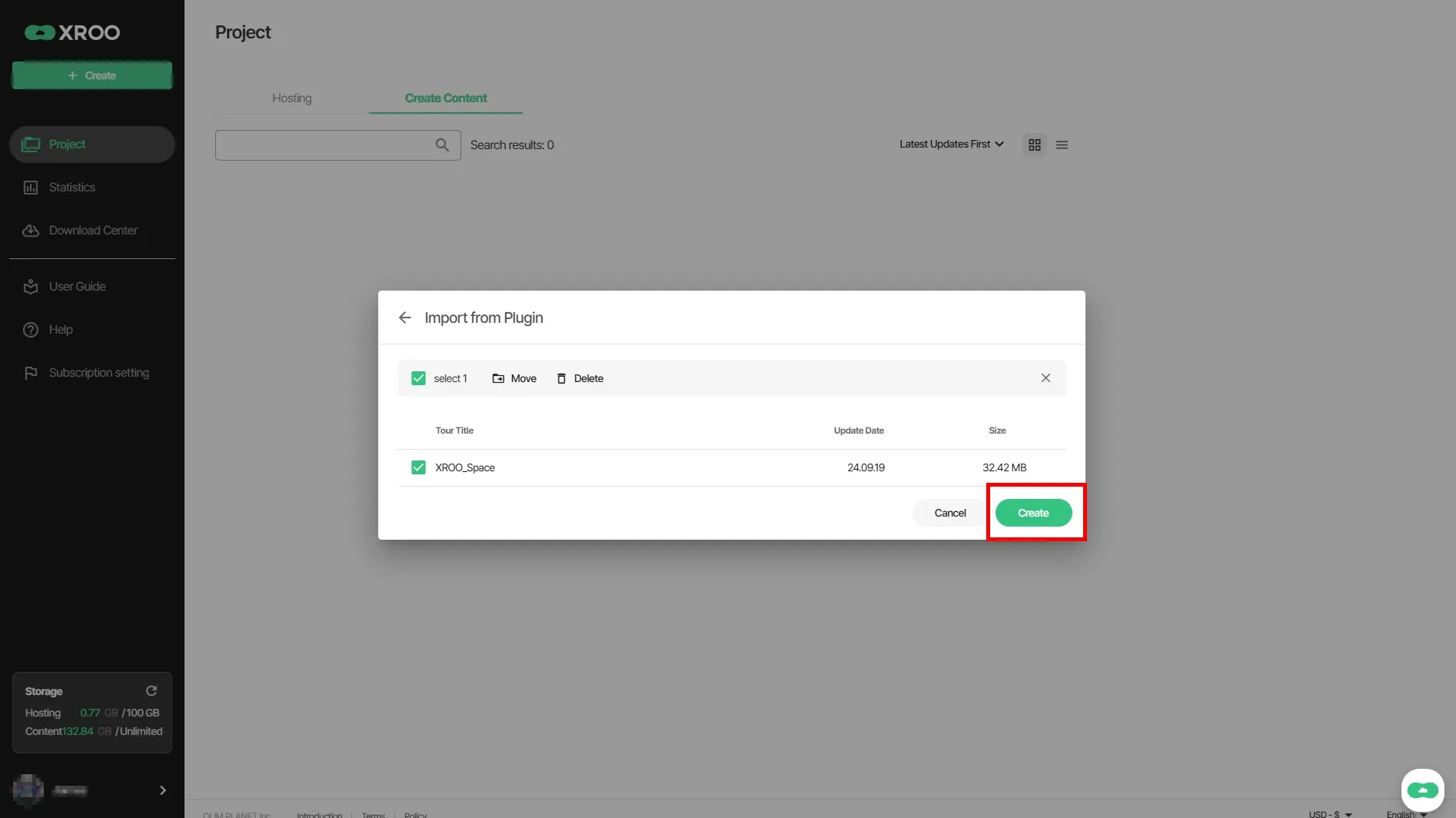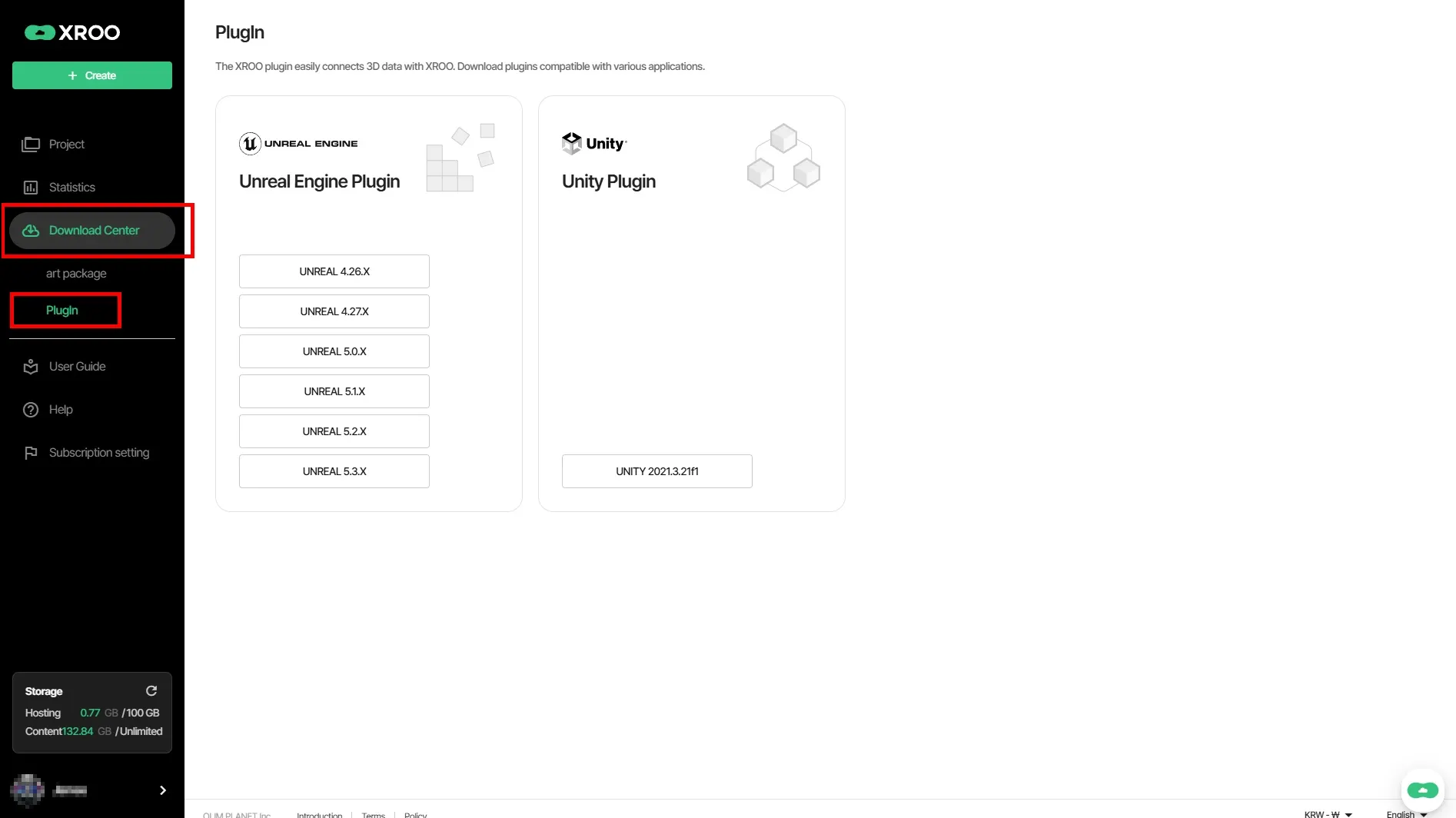 Log in to XROO and click on "My Projects" → "Create Content" → "Download Center" in sequence.