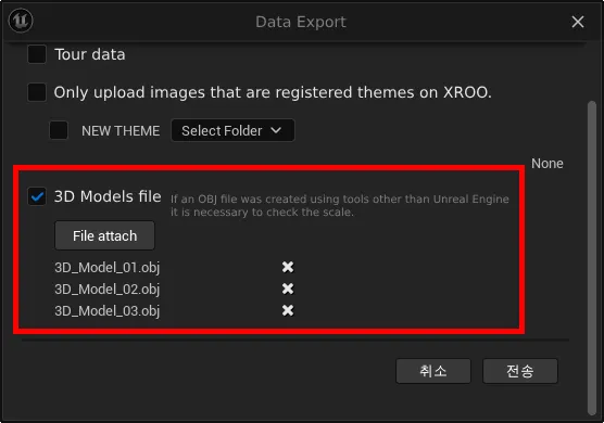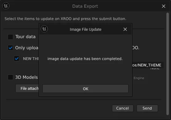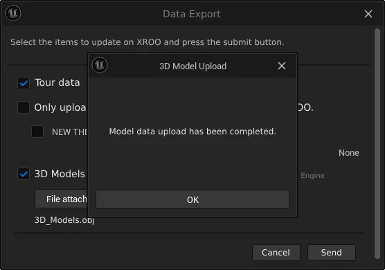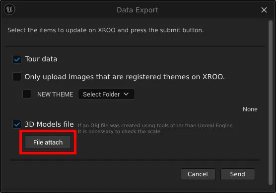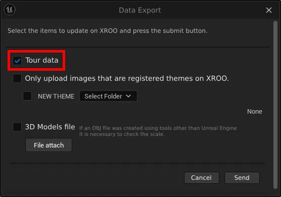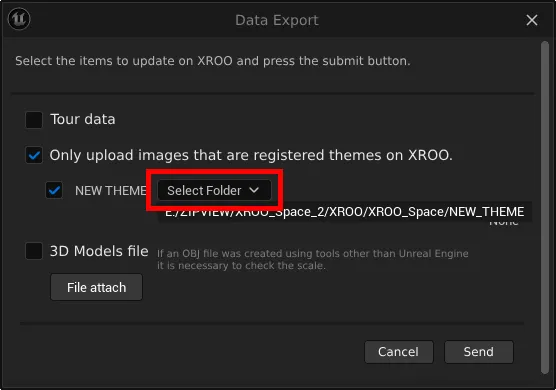 Upload the appropriate modeling files for each theme, and either send all files or select the files you want to check in XROO, then click "Send" to transfer the data to XROO.