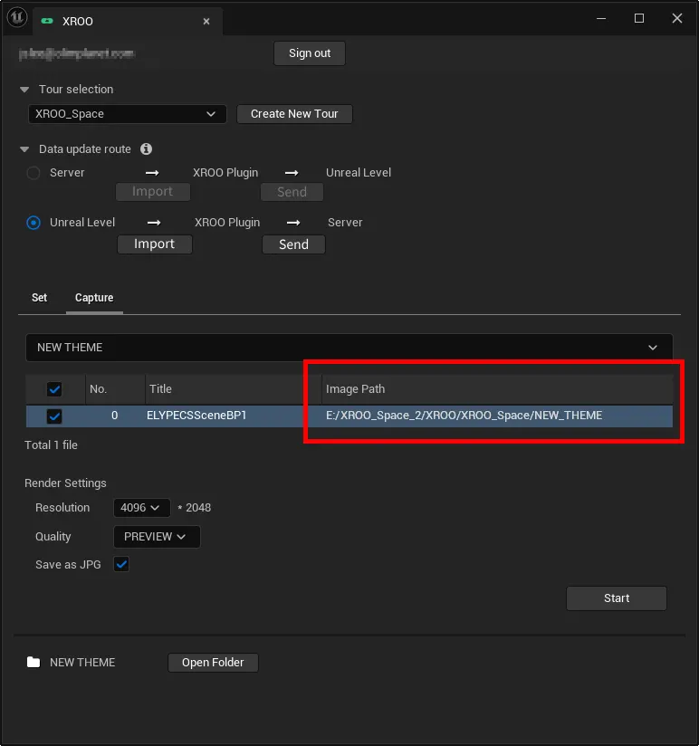 Click "Start" in the Capture tab of the XROO plugin window to begin capturing the image of the created scene.
