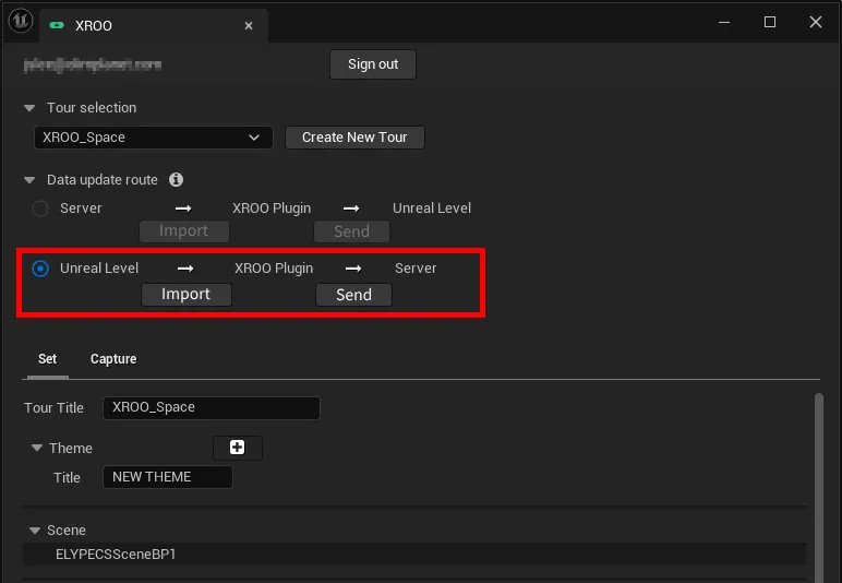 If you want to update the data from the XROO tour to the UE level, click the right-facing arrow at the top (Import, then Export) to update.