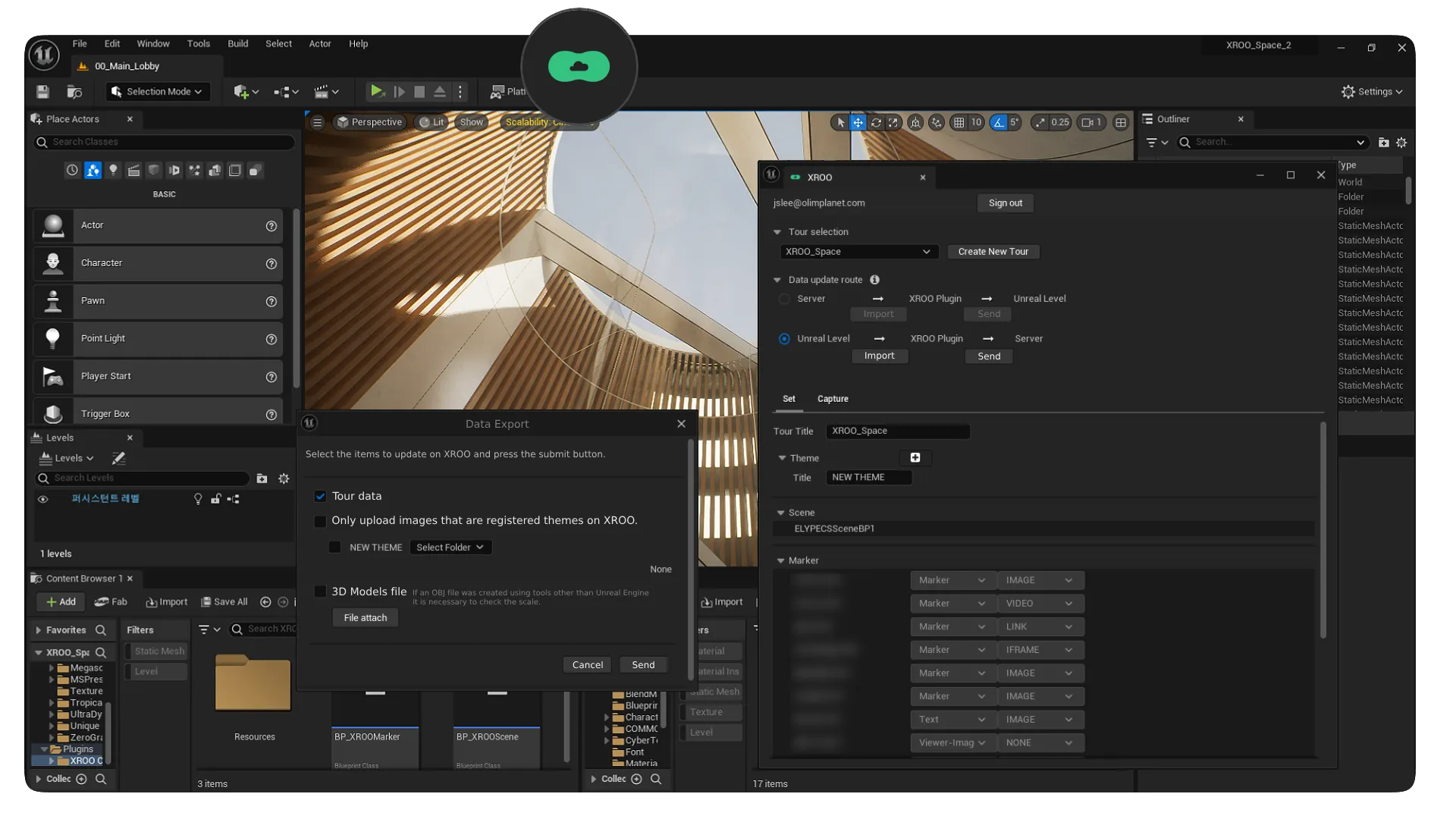 XROO Unreal Plugin is a program that extracts content created with Unreal Engine into a data format that can be edited and distributed on XROO, automatically creating tours on the XROO platform.