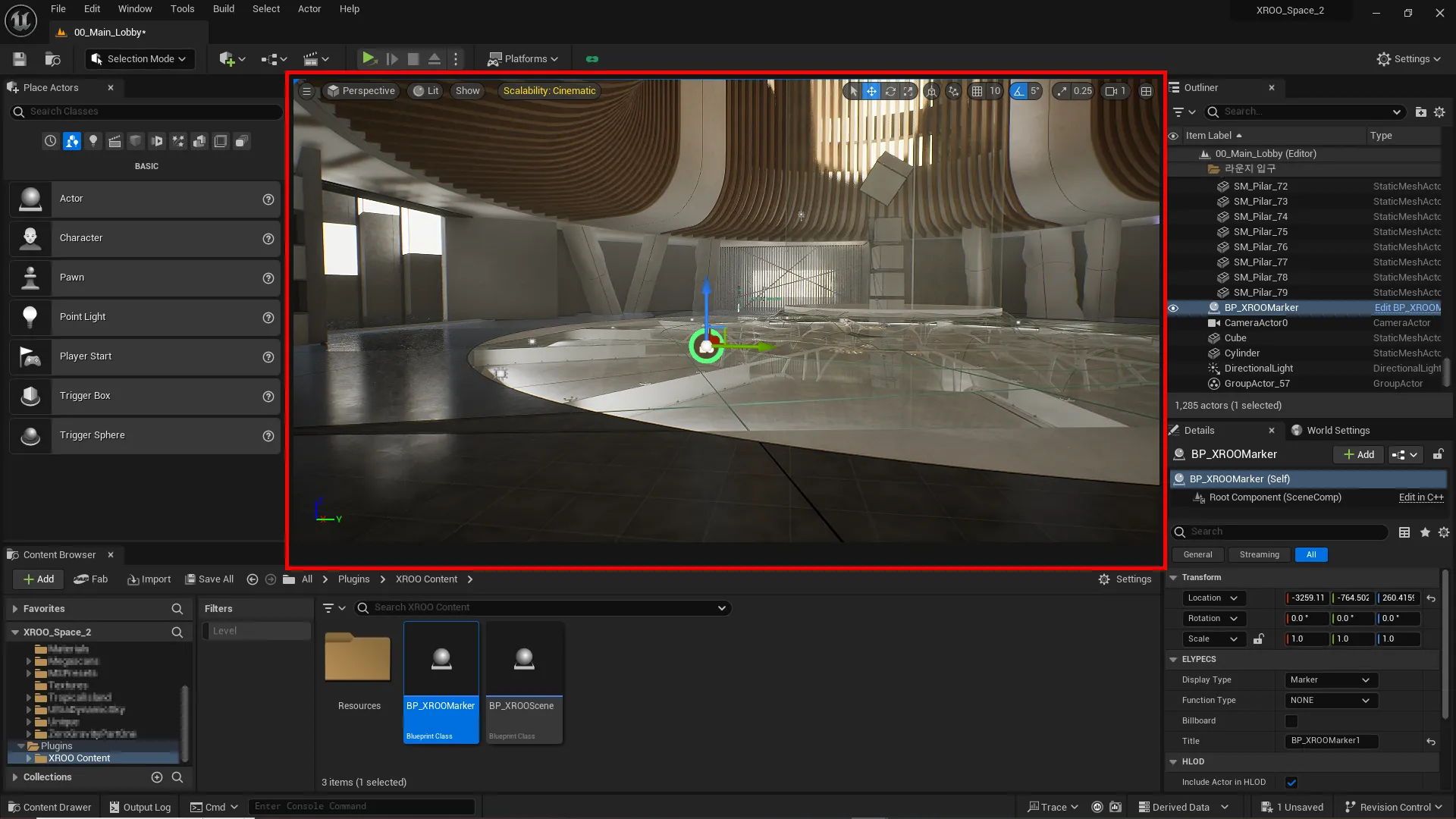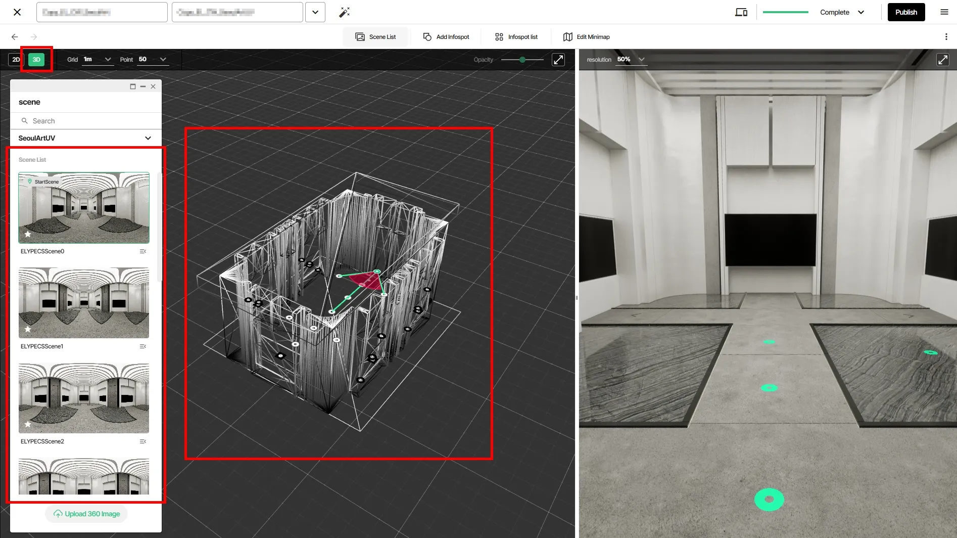 In the space editing screen, you can confirm that the 3D models uploaded through Unreal Engine are properly represented with keymaps, and that the content elements worked on in Unreal Engine are correctly displayed.