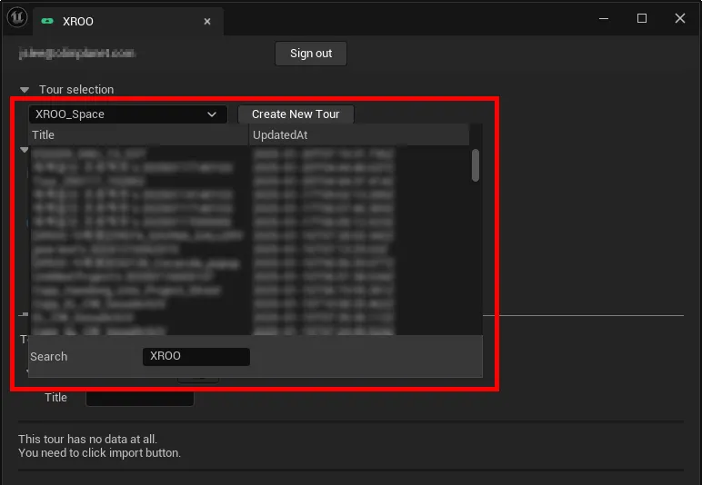 Once you have logged in with your XROO account, you will see the screen where you can load or create a tour in the Tour selection tab as shown above.