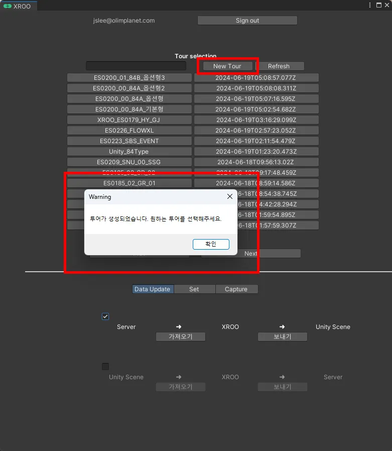 XROO 계정으로 로그인이 완료되었다면, 좌측 이미지와 같이 Tour selection 탭에서 투어를 불러오거나 생성할 수 있는 화면이 보입니다.