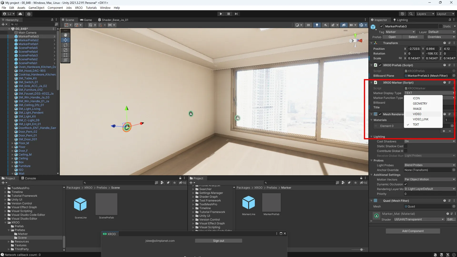 프로젝트 창에서 "XROO" 폴더를 선택하여 MarkerPrefab, ScenePrefab을 확인해 보세요.