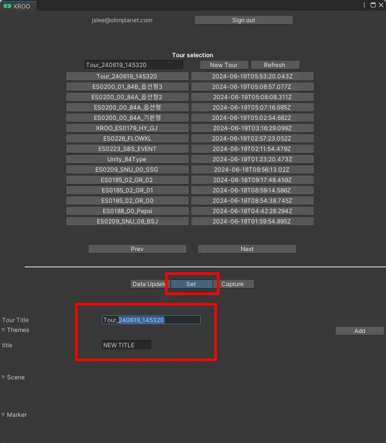 Set 탭을 선택하고 투어 기본 정보인 Title, Theme을 입력합니다. 이 정보는 추후 XROO 홈페이지에서도 동일하게 수정할 수 있습니다.