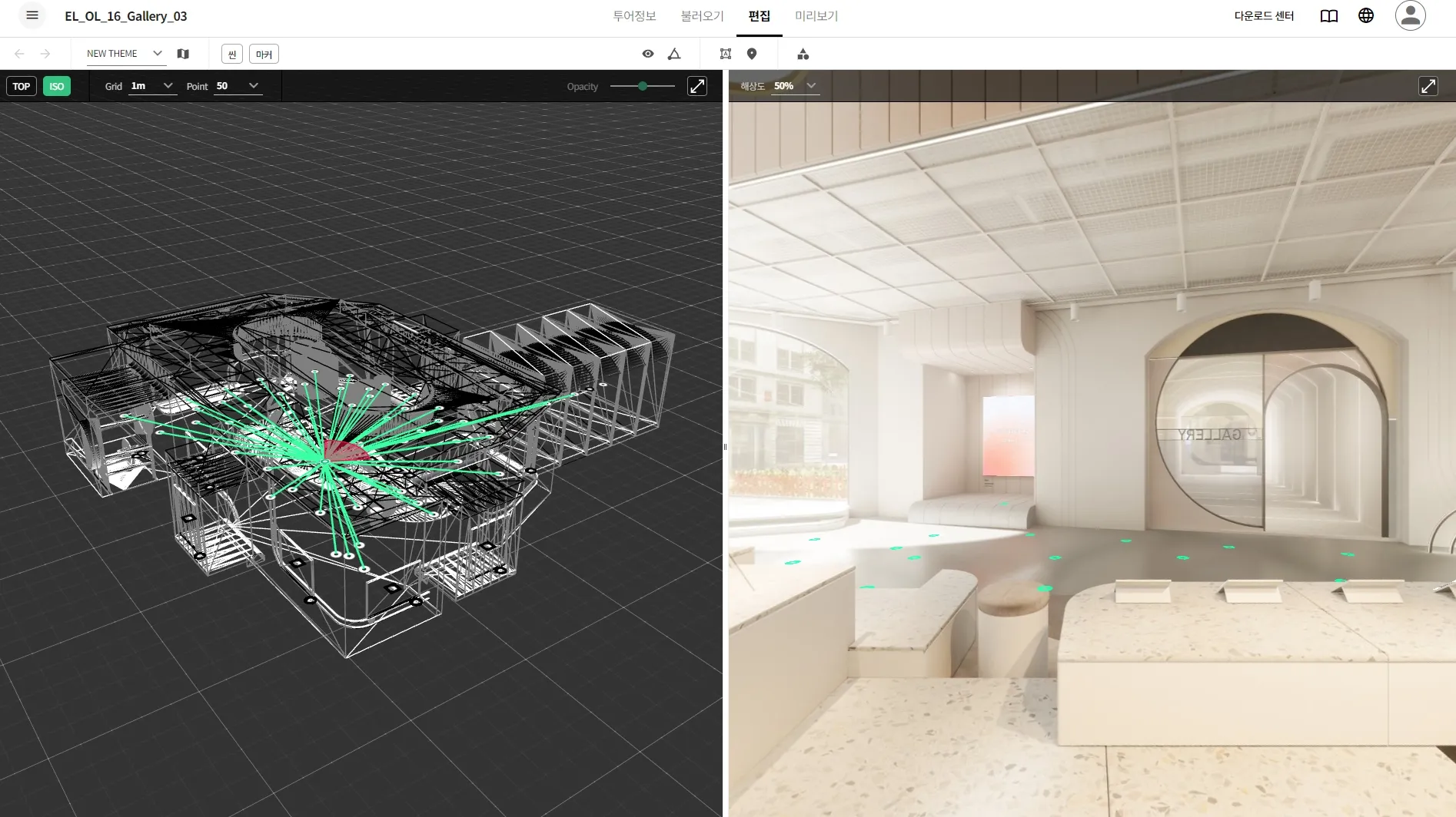 Edit 탭에서 유니티를 통해 업로드한 3D 모델링이 키맵으로 제대로 표현되고 있음은 물론, 유니티에서 작업한 콘텐츠 요소들이 제대로 노출되고 있음을 확인할 수 있습니다.