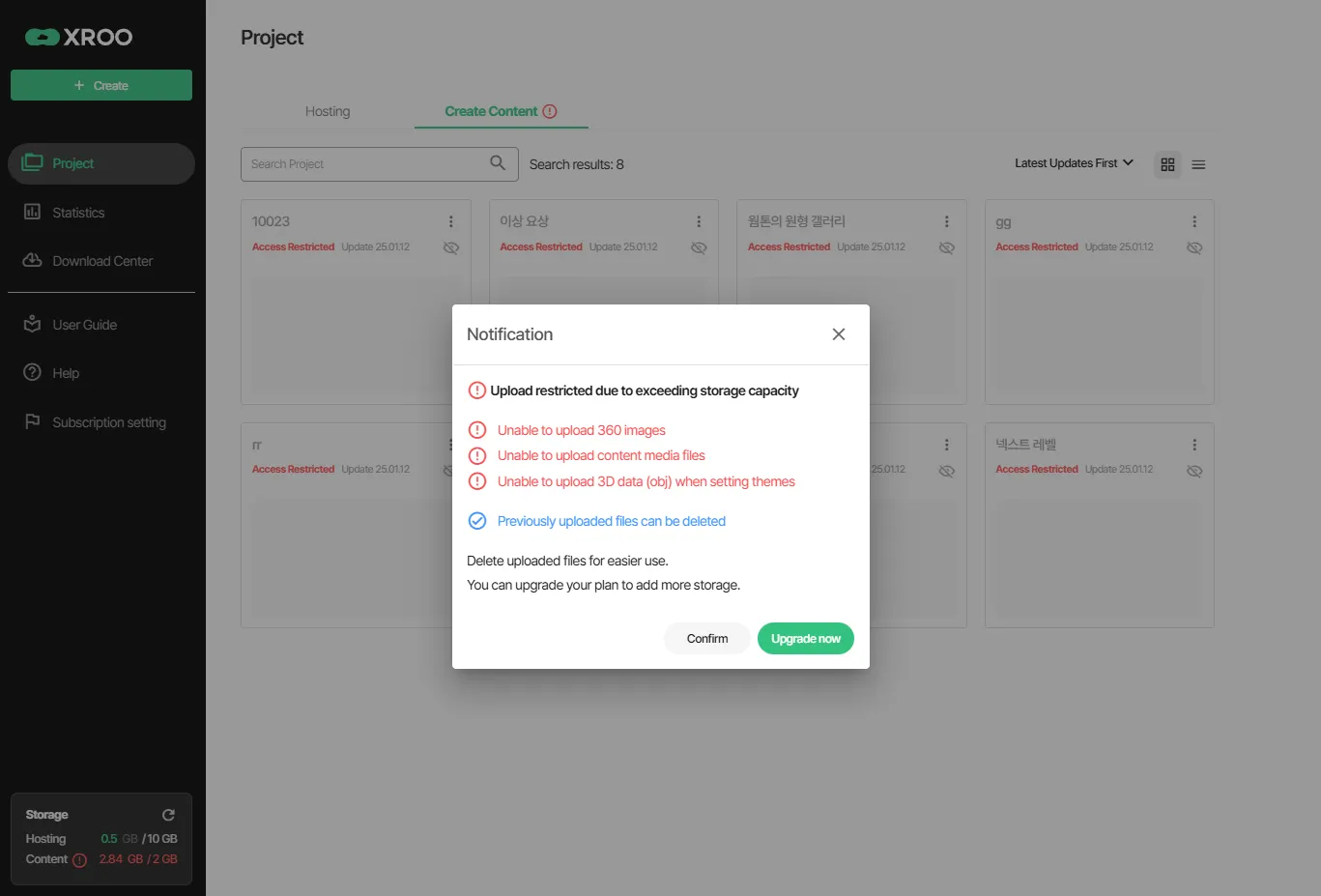 Delete files uploaded during editing or projects created from templates to bring storage usage back within the limit.
