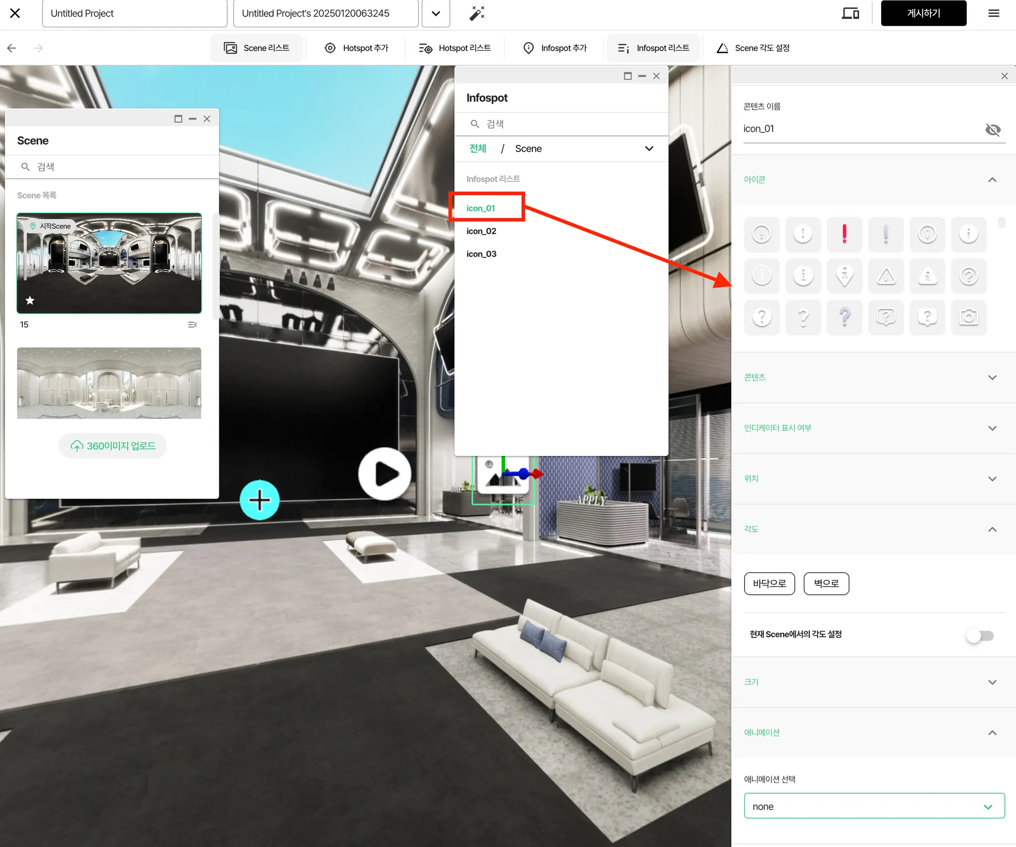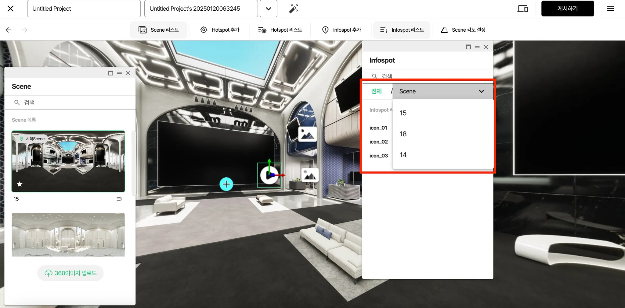 드롭다운 메뉴를 통해 Scene을 선택하면 해당 Scene에 포함된 Infospot만 표시됩니다.