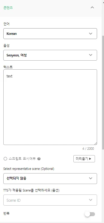 해당 Scene 위치시 TTS가 자동 재생됩니다.
