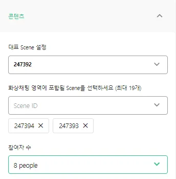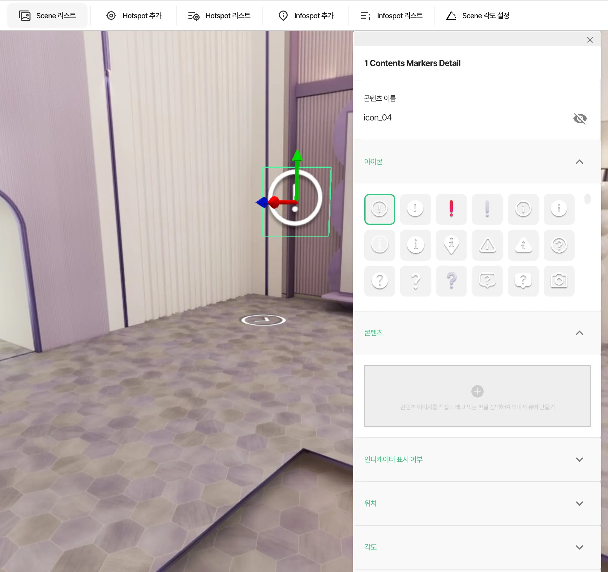 콘텐츠 영역은 아이콘 타입에 따라 이미지, 비디오 URL, iframe 링크 URL, 링크 URL, 링크할 씬 등이 설정 가능합니다.