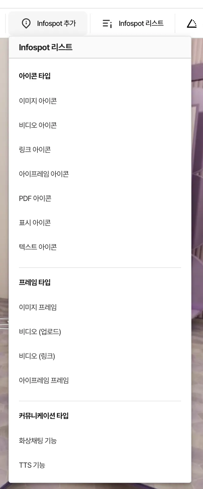 상단 툴바에서 원하는 기능의 Infospot을 선택해 추가해보세요.