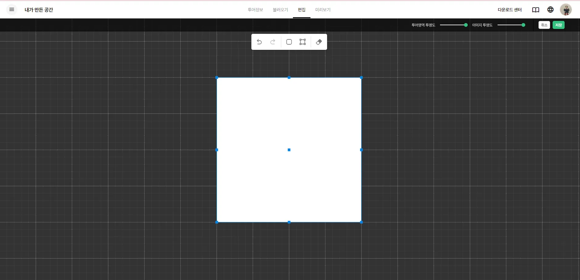 360이미지를 업로드하여 씬을 구성하였을 경우, 편집 페이지에서 투어 영역 설정하기 버튼이 화면에 표시됩니다.