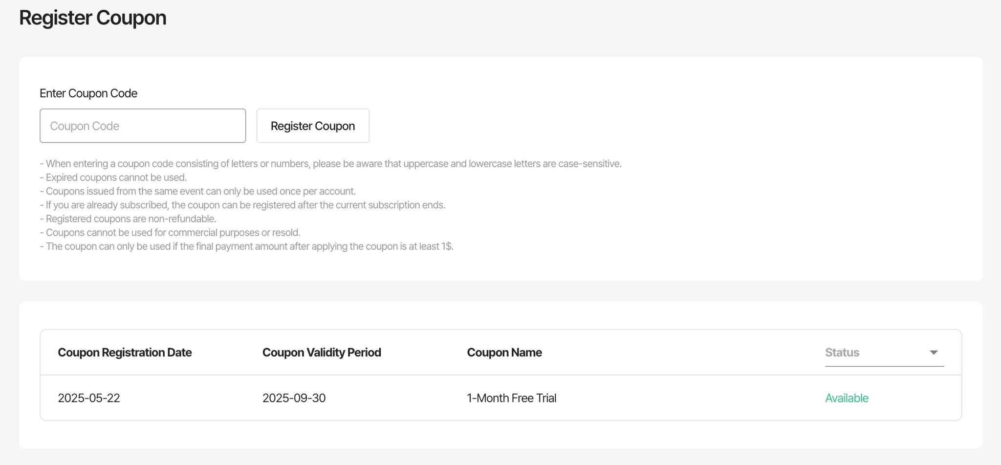 After registering a coupon, you can check its status under [Settings > Register Coupon].
