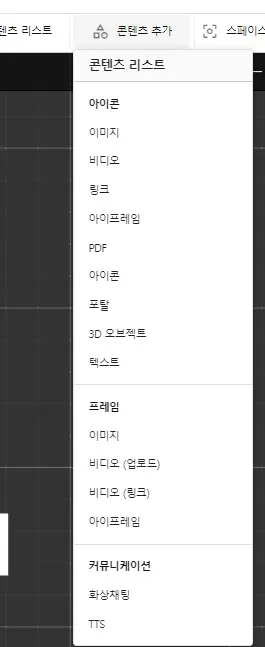 스페이스에서 ‘프레임형 콘텐츠’ 클릭시 모달에서 표시할 콘텐츠를 설정할 수 있습니다.