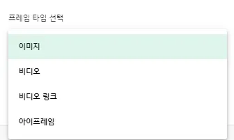 프레임 타입 설정에 따라 이미지, 비디오 업로드, 비디오 URL, 아이 프레임 링크 URL 등을 설정 가능합니다.