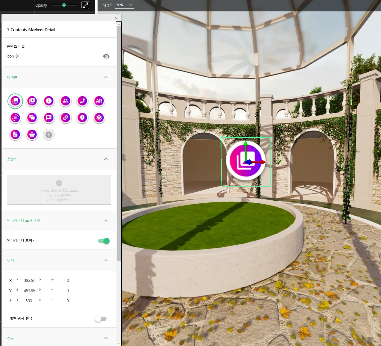 콘텐츠의 위치는 3D영역에서 아이콘을 움직여 지정하거나 상세 정보 영역에서 값을 입력하여 지정할 수 있습니다.