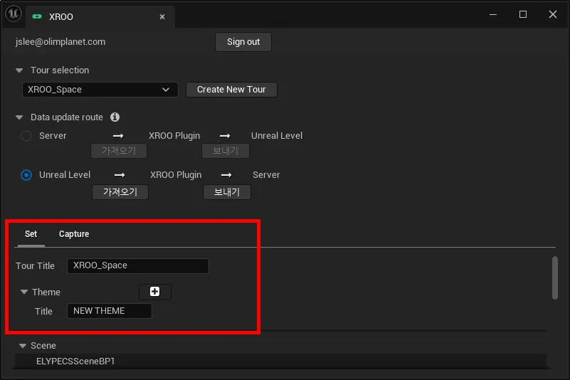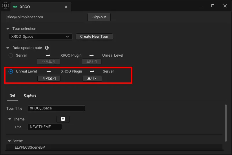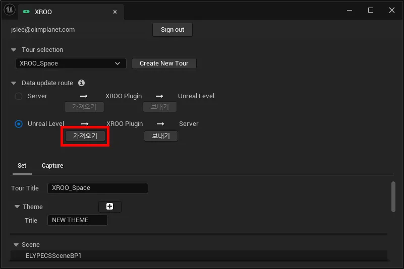 XROO 투어의 데이터를 언리얼 레벨에 업데이트하고자 하는 경우 상단의 우향 화살표(가져오기 후, 보내기)를 클릭하여 업데이트하세요.