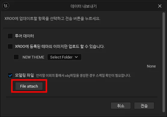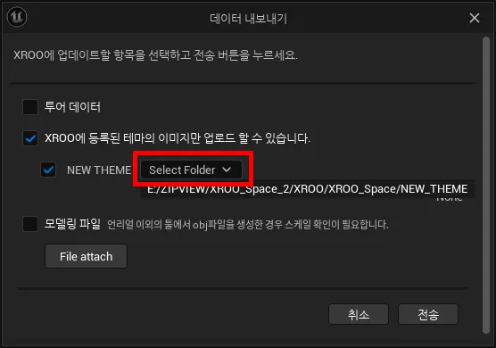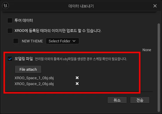 각 테마에 적절한 모델링 파일을 업로드하고 해당 파일을 모두 전송하거나 XROO에서 확인하고자 하는 파일을 체크 후, 전송을 클릭하여 XROO로 데이터를 전송하세요.