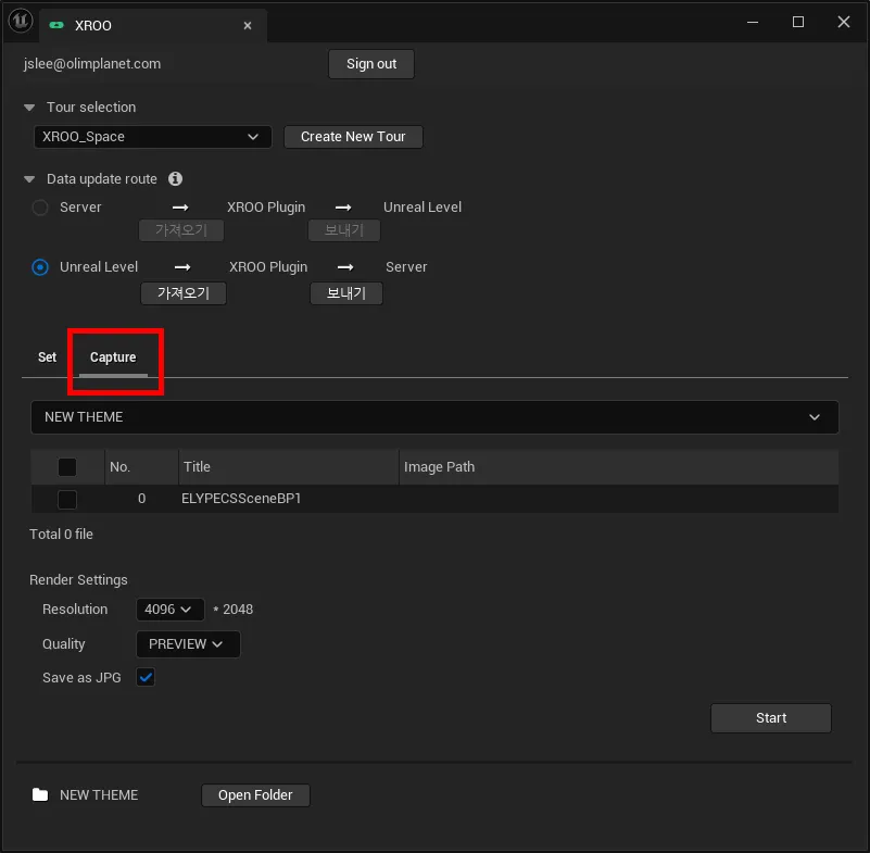 XROO 플러그인 창의 Capture 탭에 있는 Start를 클릭하여 생성한 씬의 이미지 캡쳐를 시작합니다.