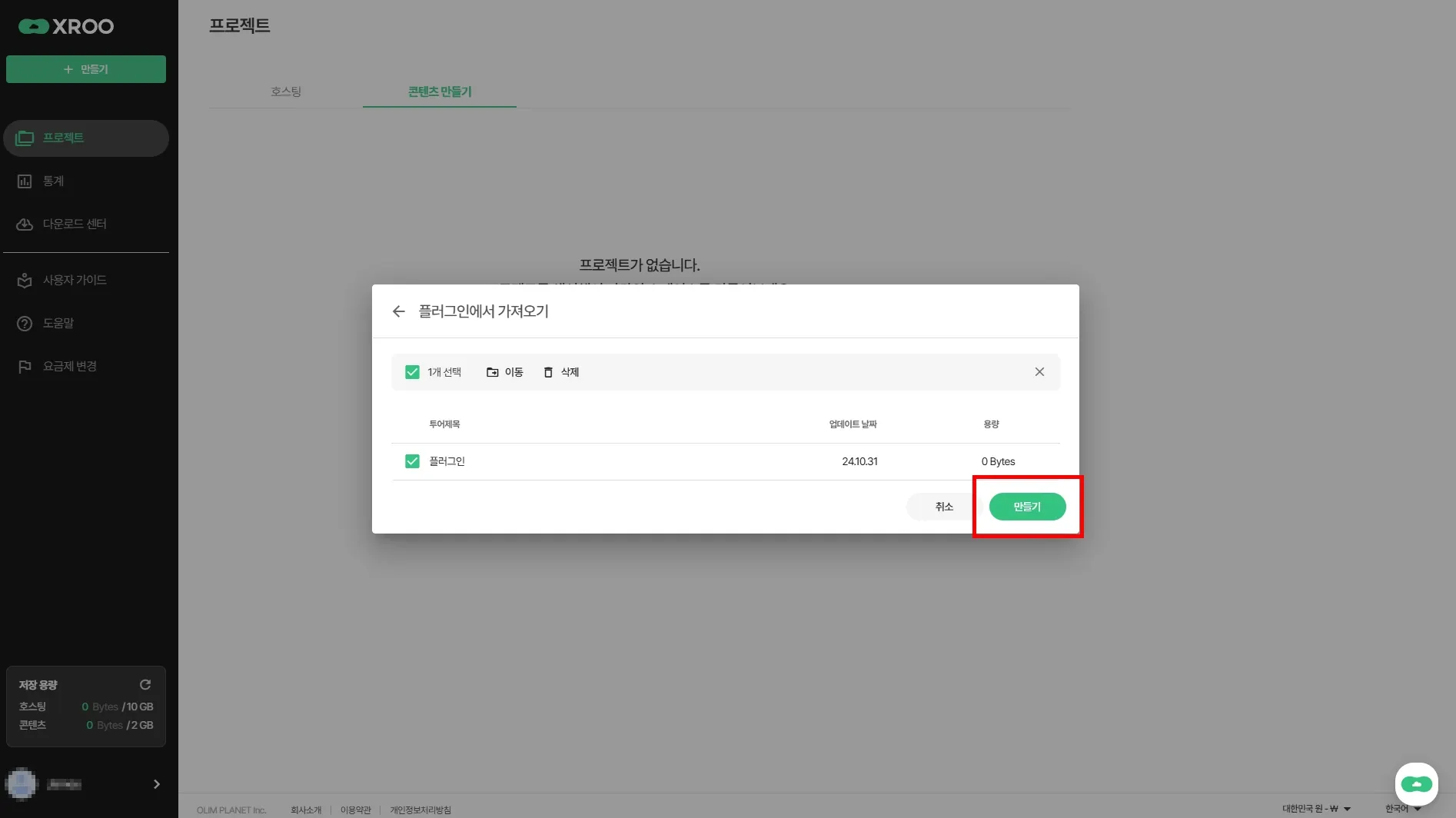 XROO에 로그인하여 “내 프로젝트”→”콘텐츠 만들기”→ “다운로드 센터” 메뉴를 차례로 클릭합니다.