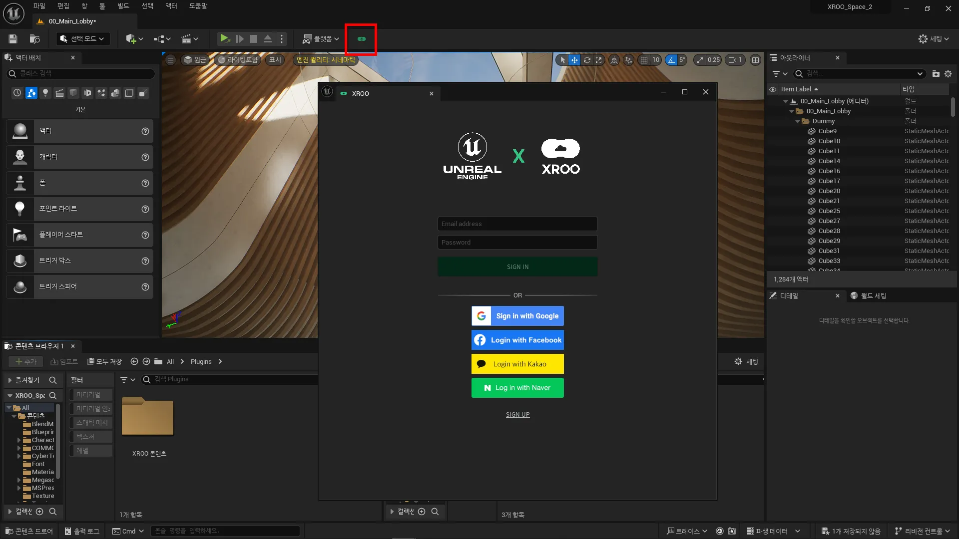 프로젝트를 오픈하면 툴바에 XROO 플러그인이 설치/생성되었음을 확인할 수 있습니다.