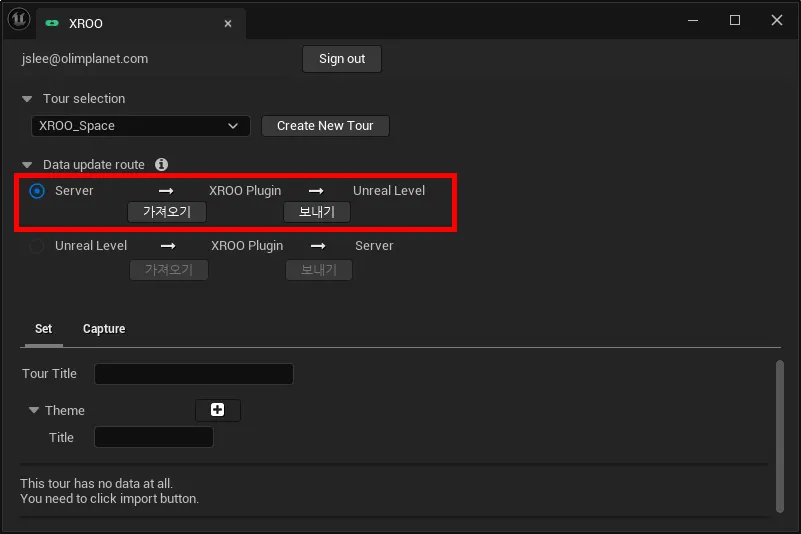 ‘Import’와 ‘Export’는 사용자의 업데이트 된 작업 데이터를 XROO의 투어와 언리얼의 프로젝트 중 각각