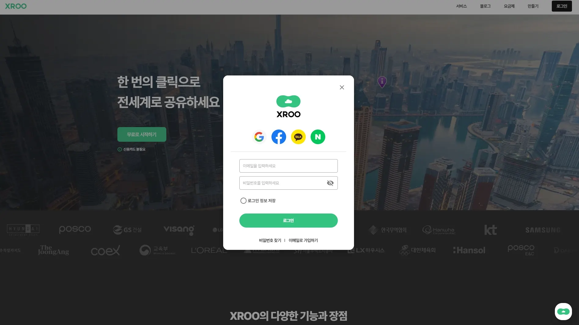 XROO 홈페이지에서 사용하는 동일한 계정(구글, 페이스북, 카카오, 네이버)으로 로그인을 할 수 있으며,