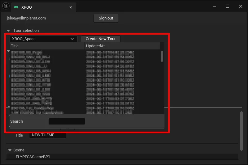 XROO 계정으로 로그인이 완료되었다면, 위와 같이 Tour selection 탭에서 투어를 불러오거나 생성할 수 있는 화면이 보입니다.