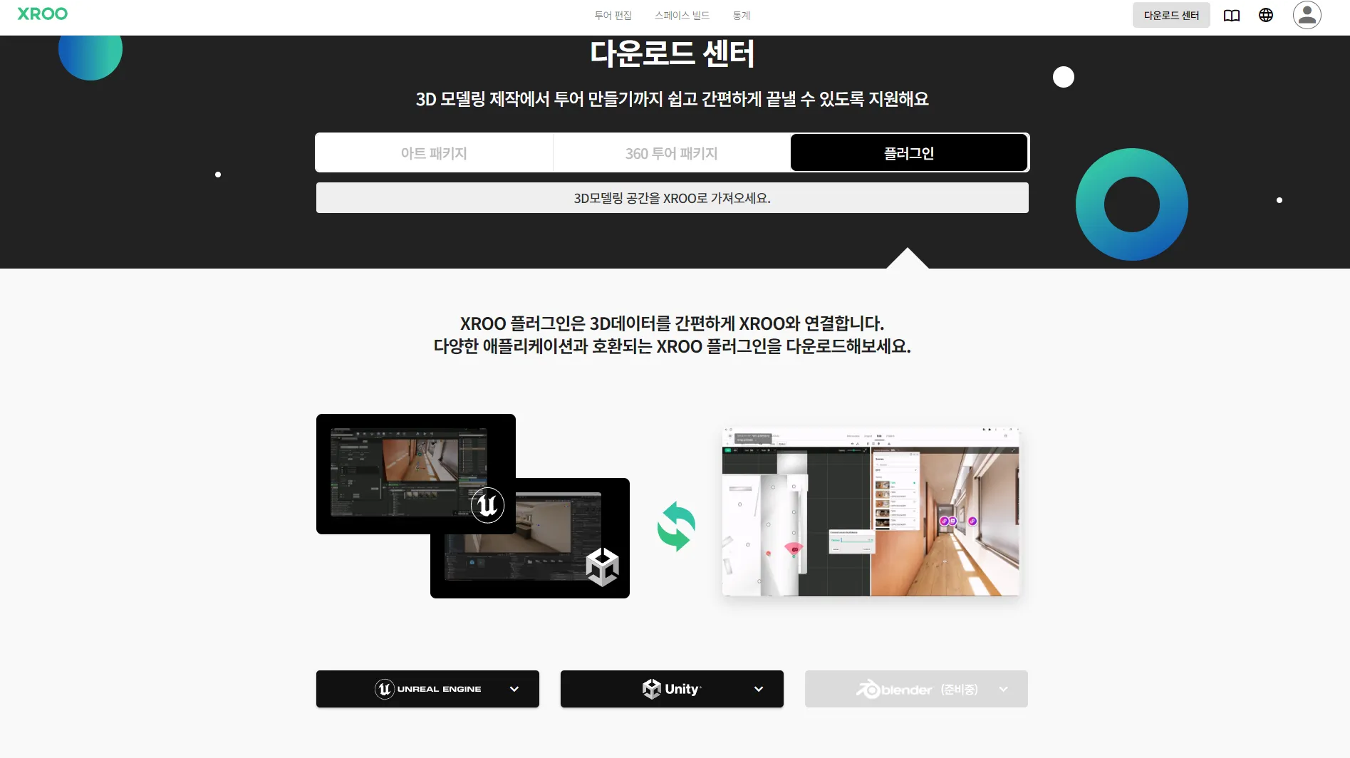 XROO에 로그인하여 “만들기”→”다운로드 센터”→"플러그인" 메뉴를 클릭합니다.