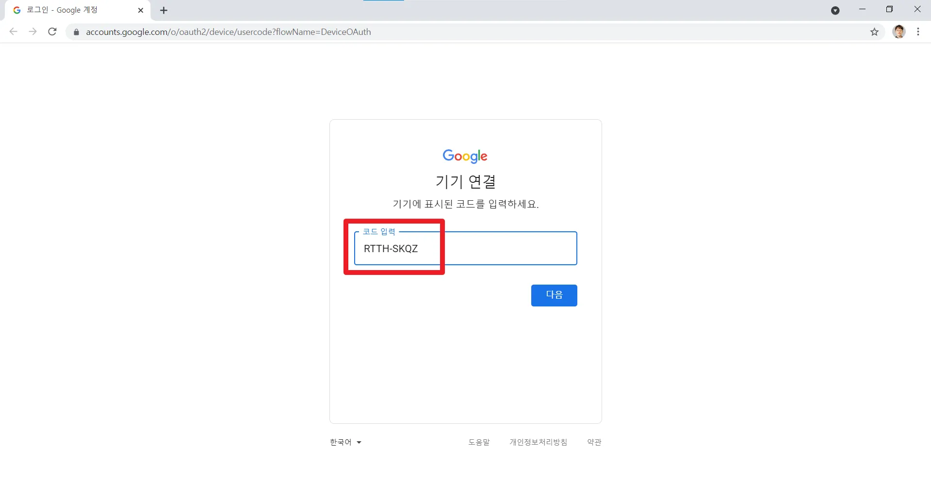2-2. 동시에 브라우저로 오픈된 사용자 코드 입력 페이지에 2-1에서 복사한 사용자 코드를 입력하세요