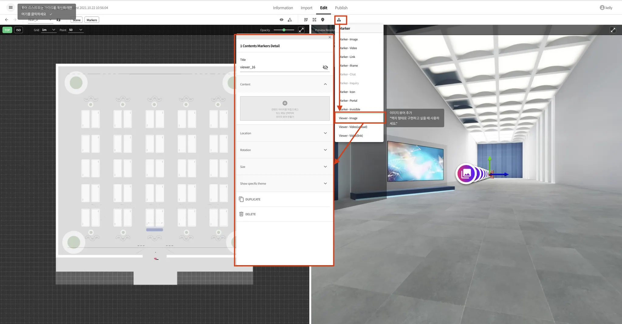 뷰어형 모듈은 비디오나 이미지를 공간에 실제로 배치한 것처럼 연출할 수 있습니다. 마커 리스트에서 원하는 기능의 뷰어를 선택하여 추가하세요.