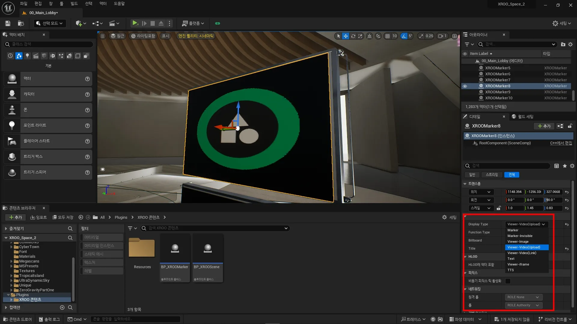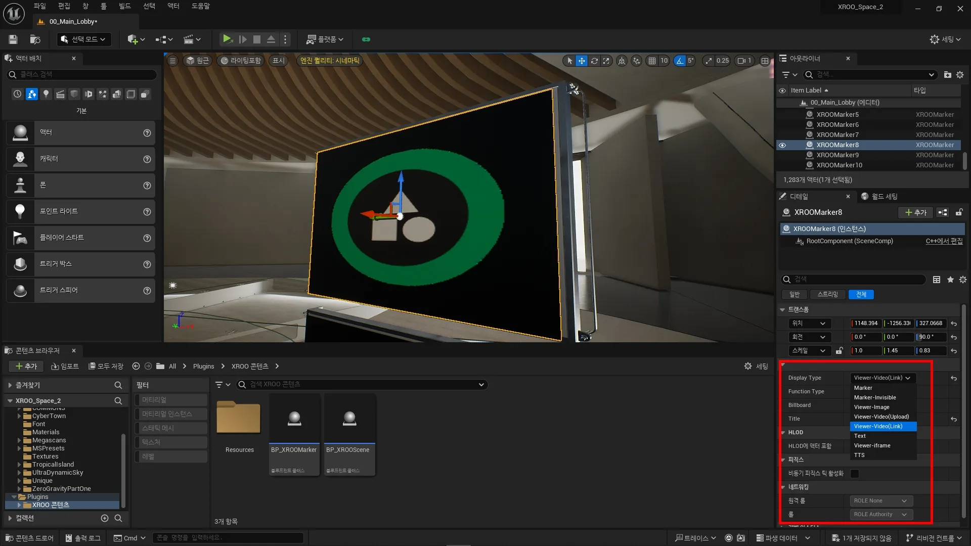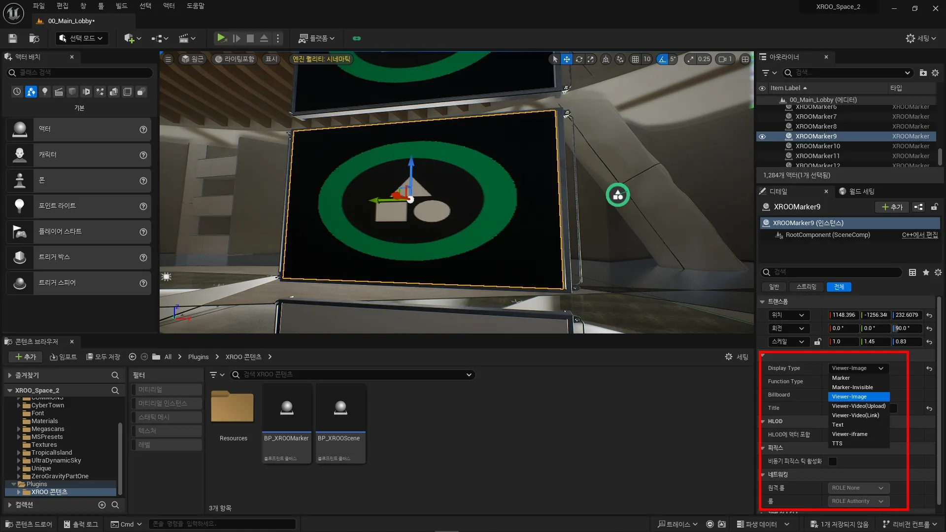 콘텐츠 브라우저에서 XROO 콘텐츠를 확인할 수 있으며, 해당 콘텐츠를 사용하여 레벨에 마커를 생성하세요.