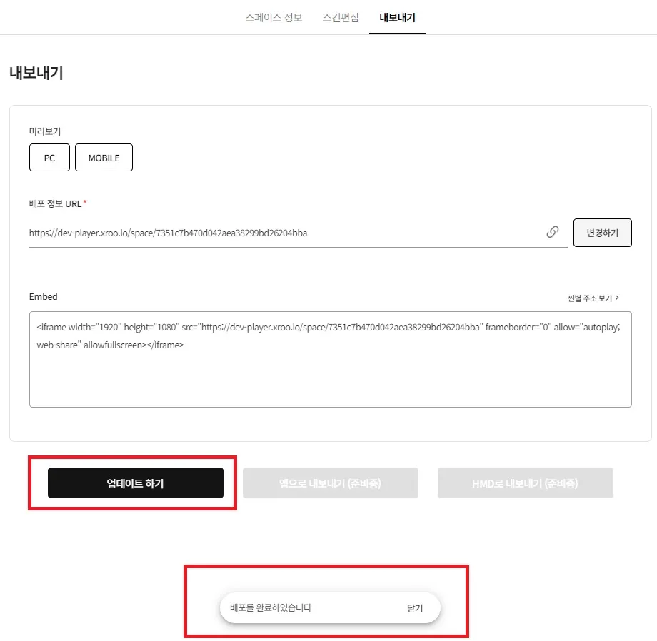 업데이트 버튼 클릭시 해당 투어를 공유할 수 있는 웹페이지 주소 및 아이프레임 소스코드(Embedding)가 생성됩니다.