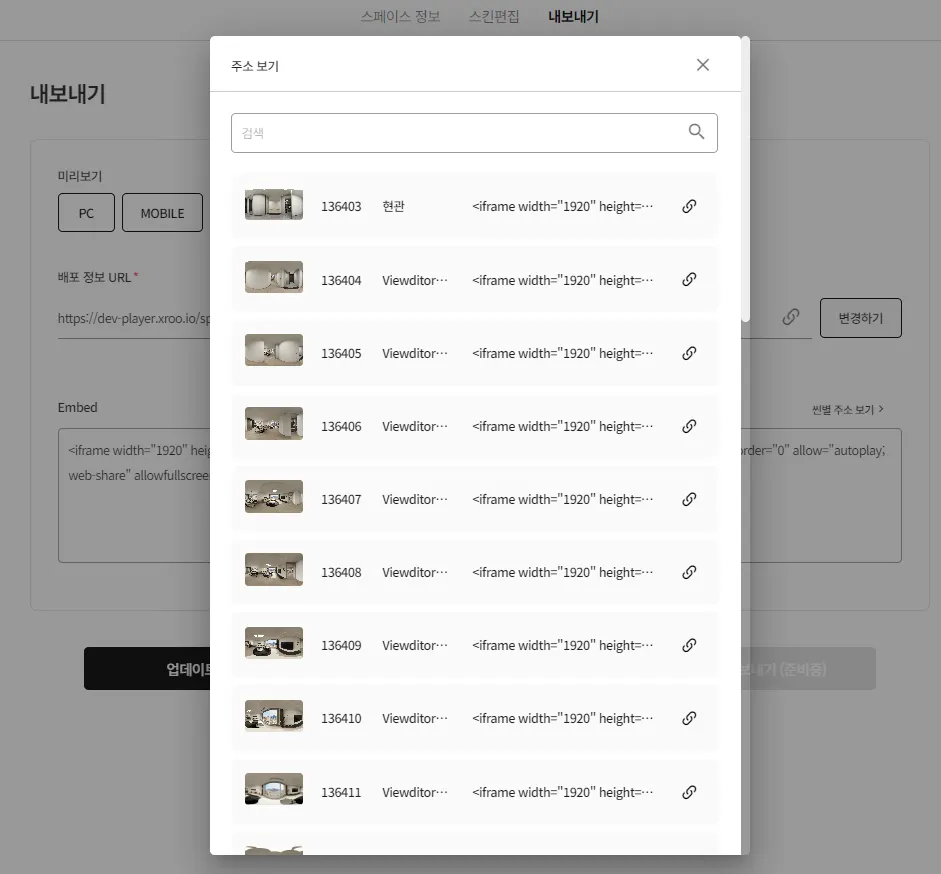 현재 투어에 생성된 씬들을 <씬별 주소 보기> 목록에서 확인할 수 있으며, 각 씬의 url 및 아이프레임 소스코드를 확인할 수 있습니다.