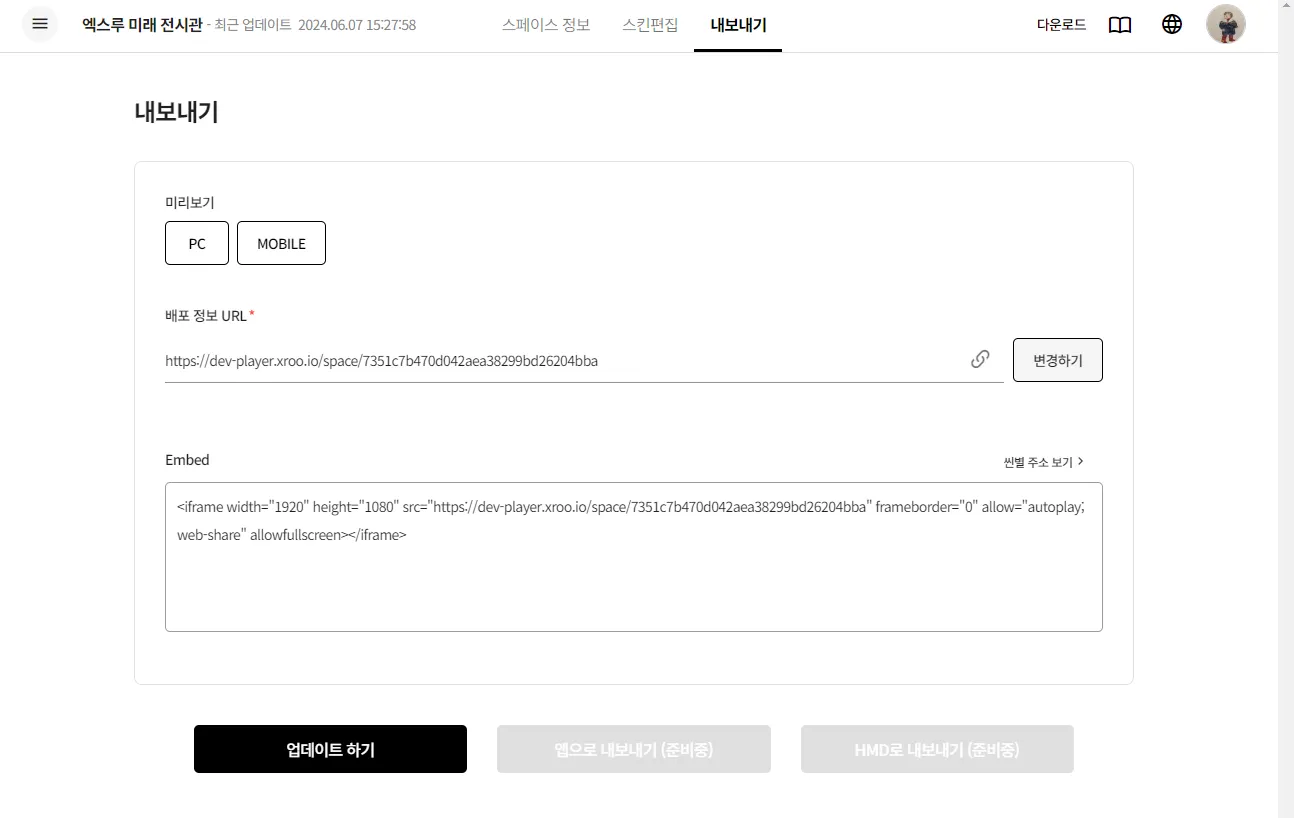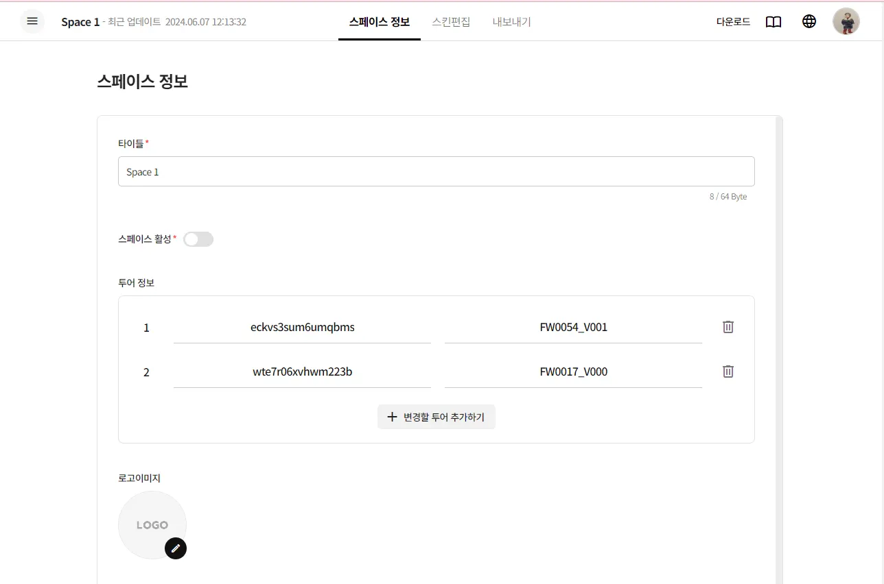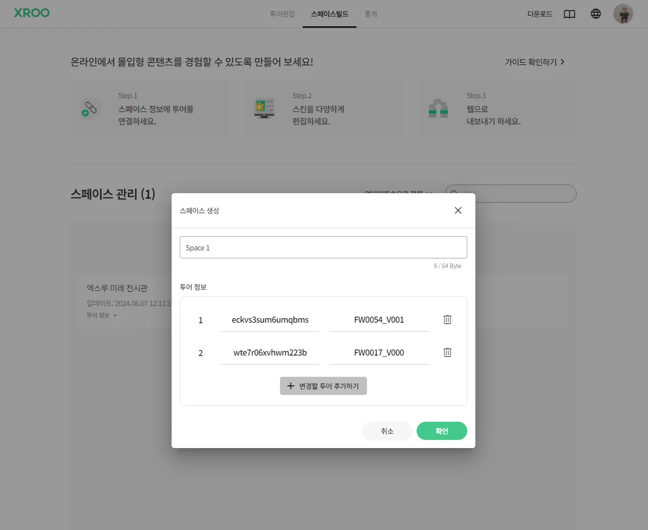 스페이스 이름과 투어 정보 입력 후 ‘확인’ 버튼 클릭